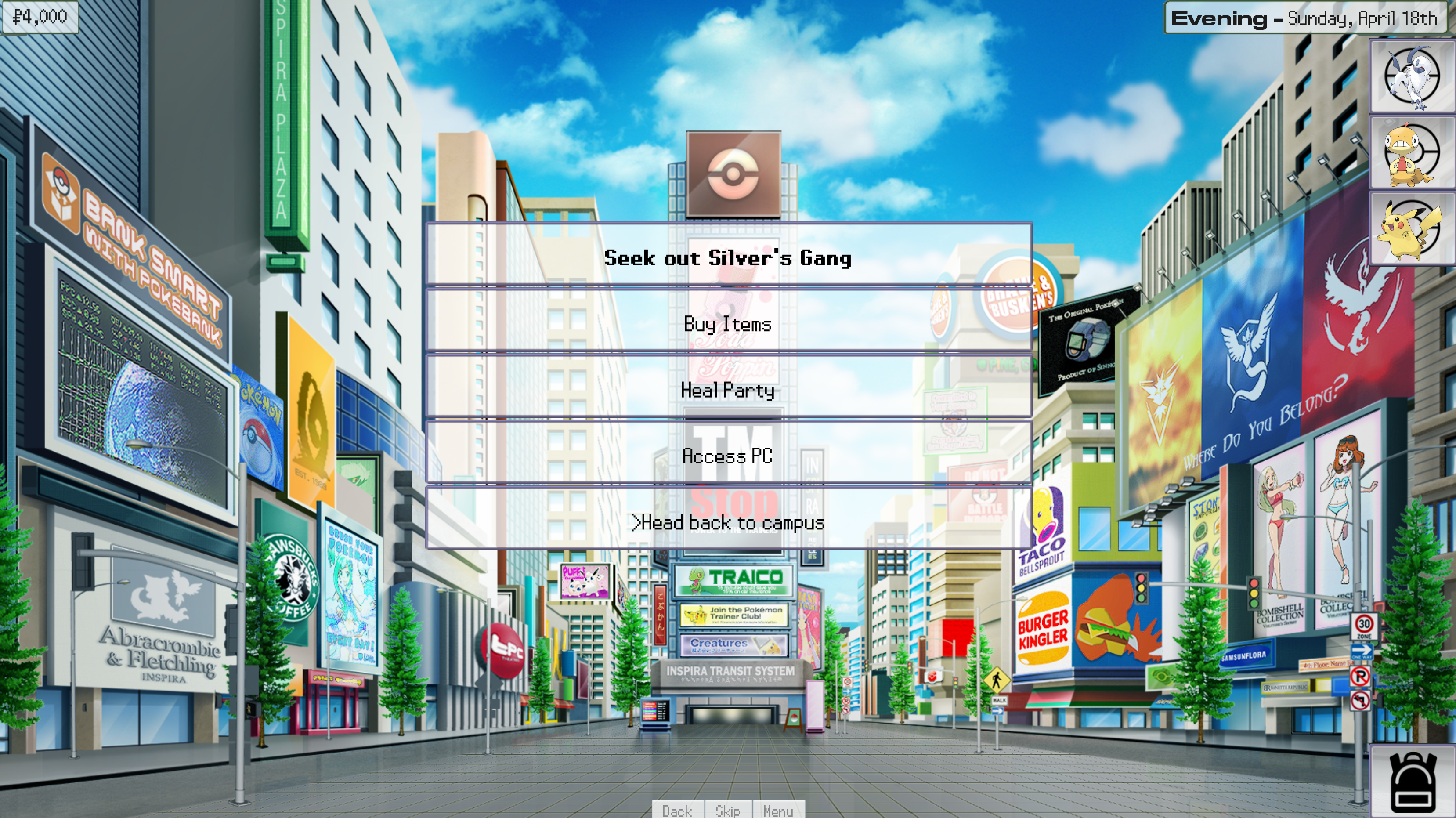 In PAL:F, you learn to manage your time between attending classes, forming bonds with people, passing tests, and catching and training an ever-expanding pool of Pokémon. The writing takes full advantage of the college setting to present players with mature storylines and problems--like how to pay for higher education.