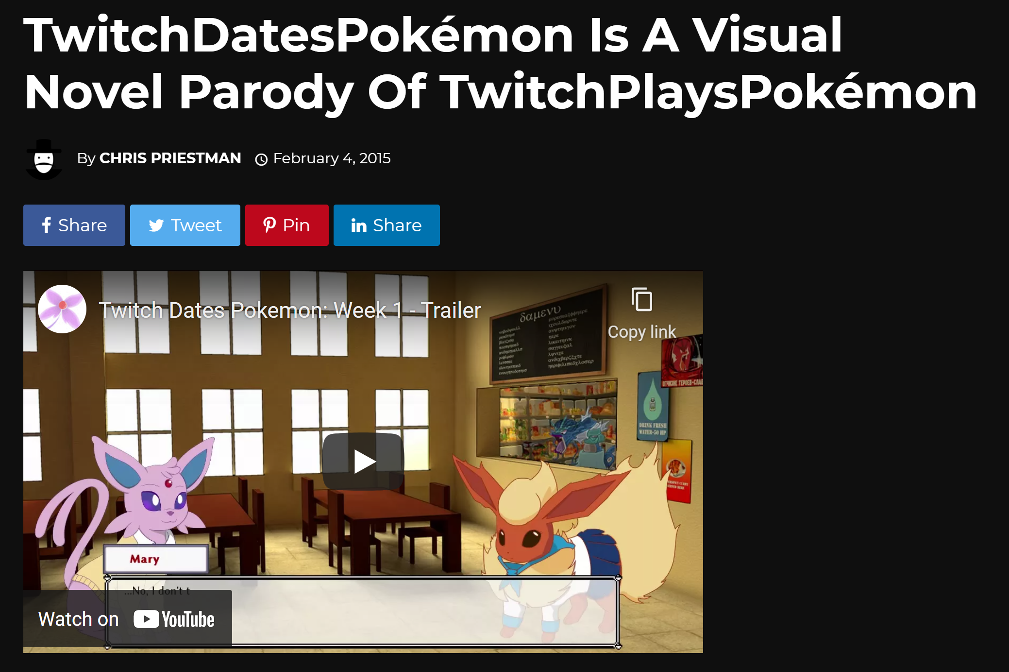 Twitch Dates Pokémon is a family-friendly visual novel that plays on and parodies many of the long-running tropes and themes of other visual novels, based around the lore of the 2014 internet phenomenon Twitch Plays Pokémon.
